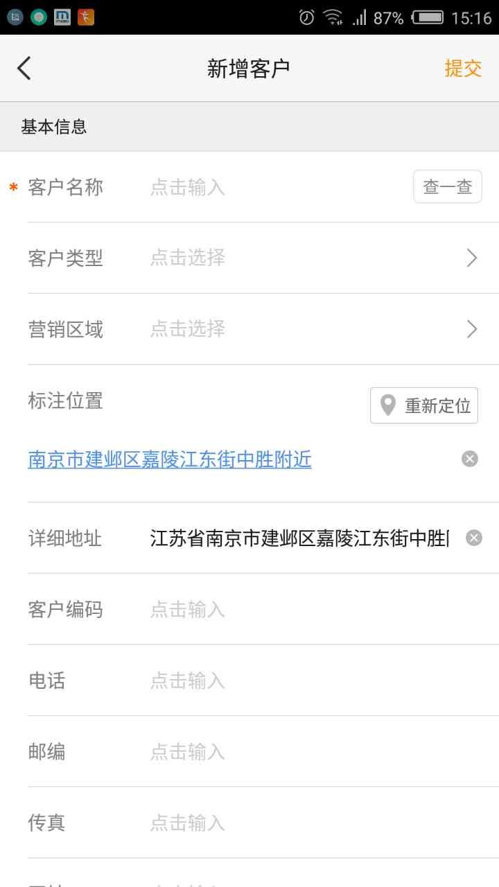 点击【客户】按钮,点击右上角“加号”按钮,选择【手动创建】,在新增客户表单中填写客户相关信息,其中带星号的为必填项,完成后点击“提交”。
