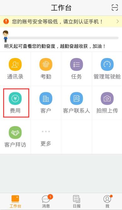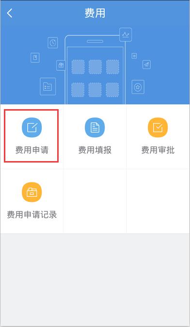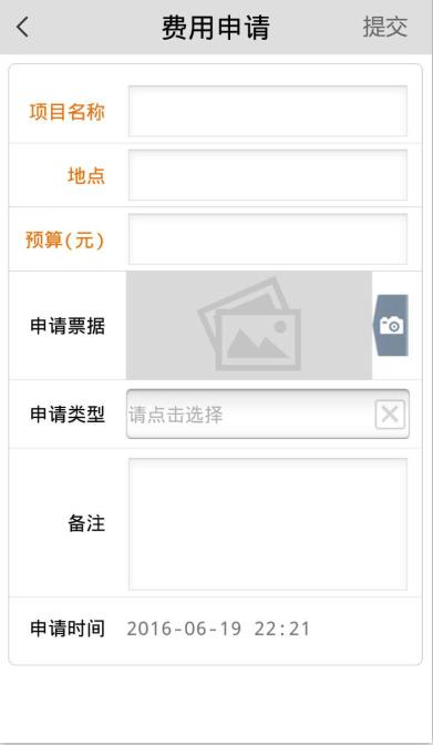 员工可以通过手机发起费用申请,点击【费用申请】按钮,填写项目名称、地点、预算、申请票据(拍照)、申请类型及备注,点击【提交】即可。