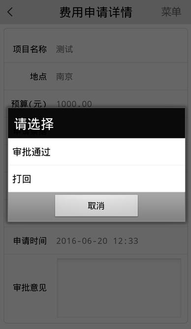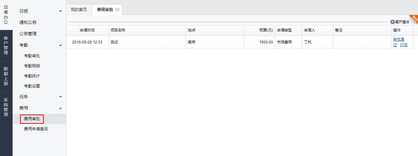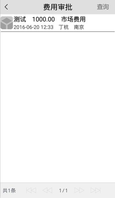 公司领导可以通过手机审批员工发起的费用申请。点击【费用审批】按钮,可以查看到需要自己审批的费用申请,点击对应的申请记录,选择是否通过申请。