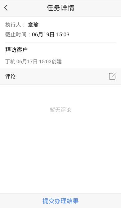 点击【任务】按钮,查看收到任务,点击详细任务,会出现任务详情(可以编写评论并@相关人员),点击提交办理结果,可以现场拍照,填写总结,后点击【提交】即可。