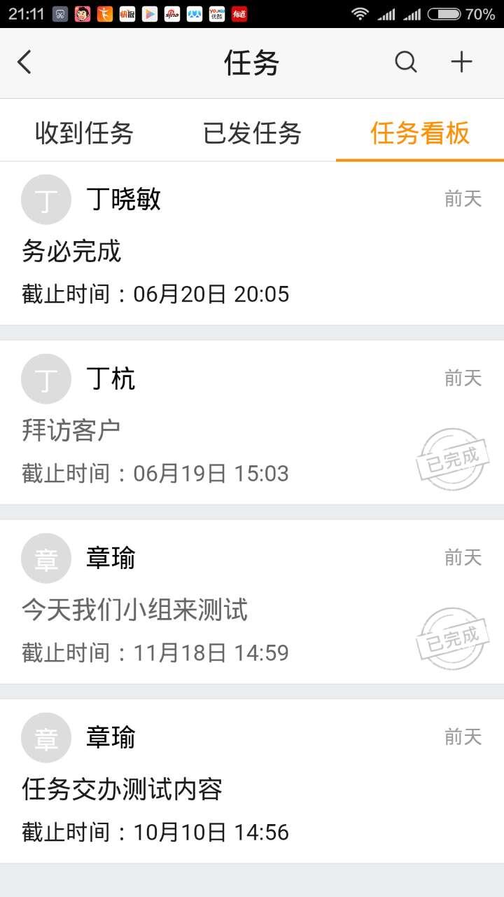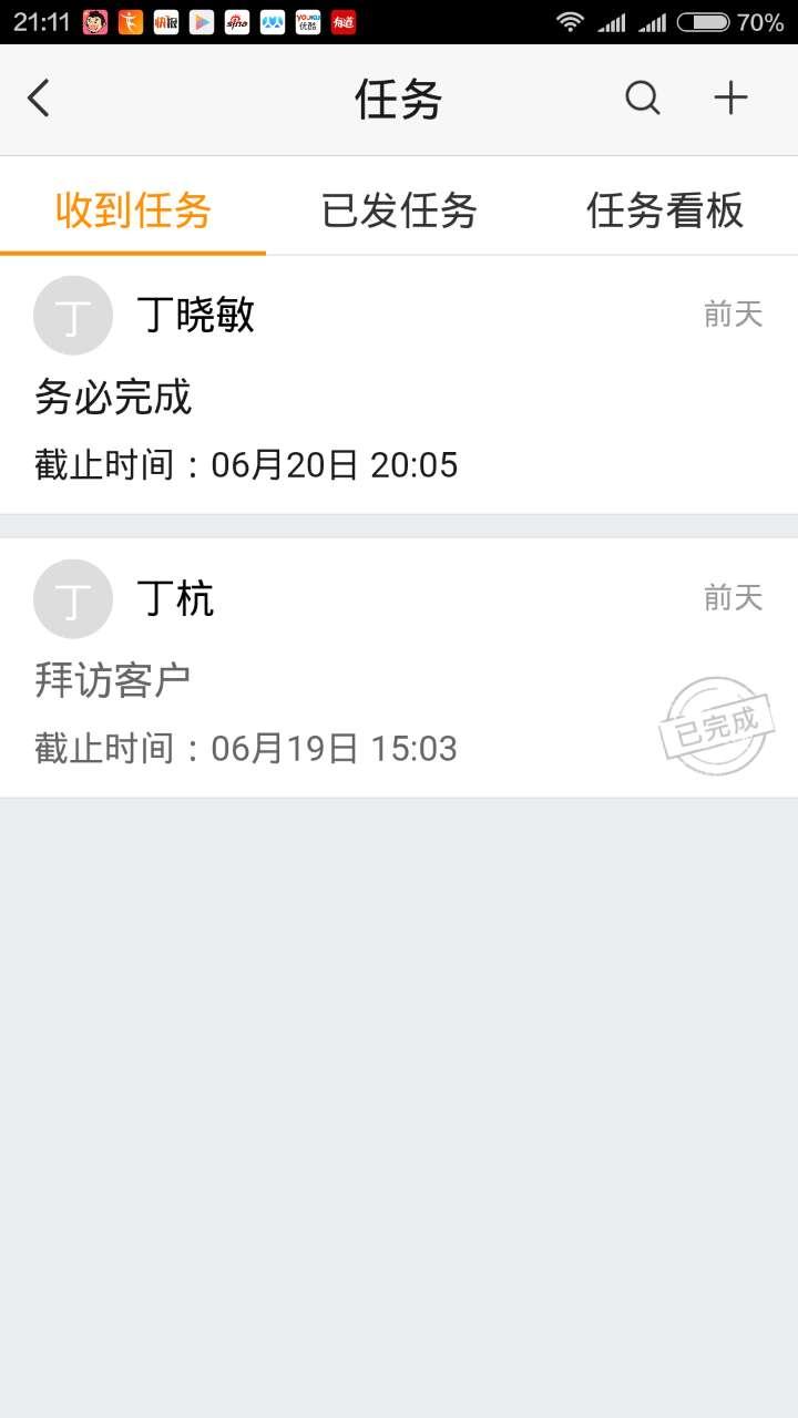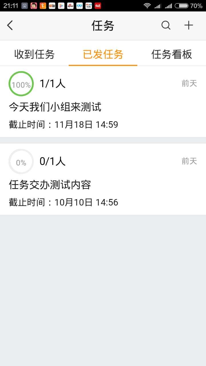 点击工作台中【任务】选项,在任务页面中点击【收到任务】,可以显示出领导及组员委派的任务,可以查询完成进度。点击【已发任务】,可以查询自己派发出的任务是否完成。点击【任务看板】,则显示出账号的所有收到及已发任务的详情及完成情况。