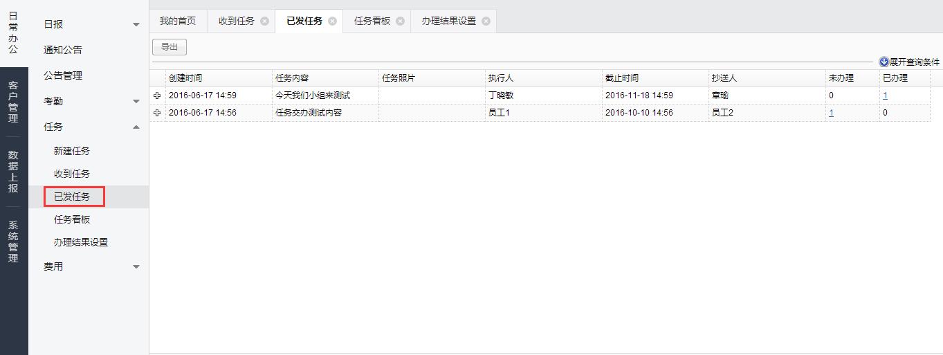 在左侧菜单栏中点击【已发任务】,可以查看已经提交的任务信息,包括优先级、办理人、完成期限、任务内容、未办理、已办理。