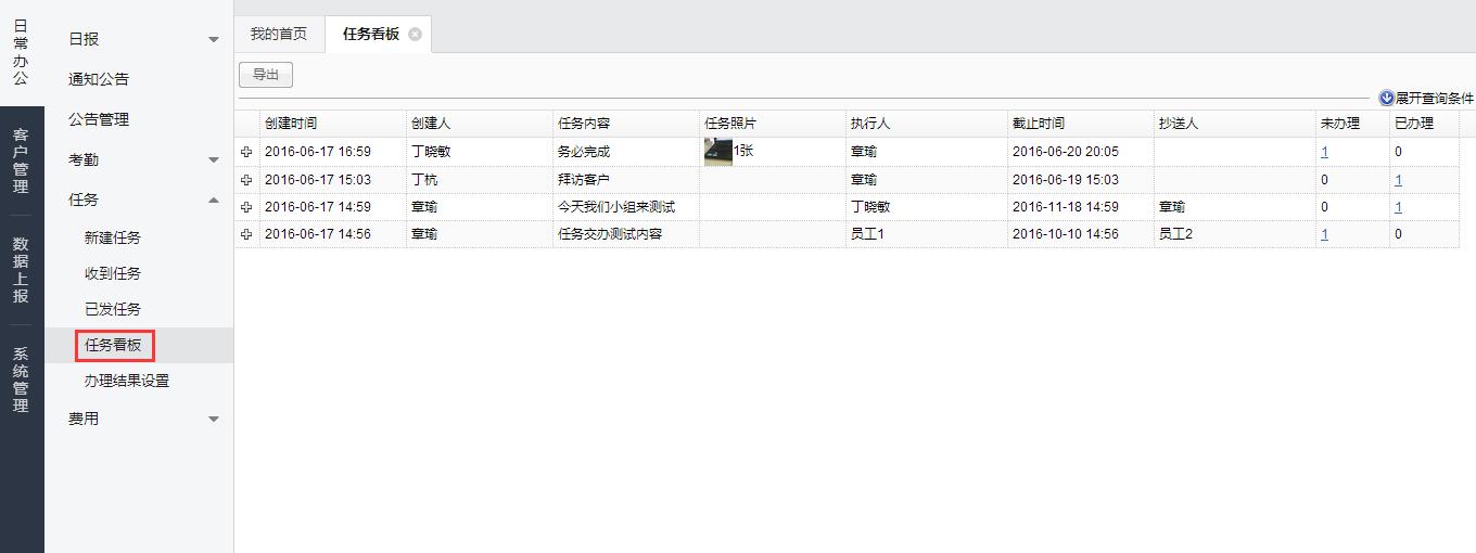 在左侧菜单栏中点击【任务看板】,可以查看自己收到的任务以及自己派发出去的任务的详情和完成情况。
