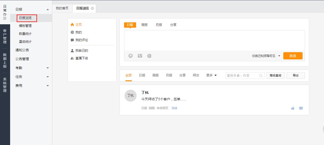 方式一:web端登录点击【日报】-【日报浏览】,可以查看自己和下属提交的日志。