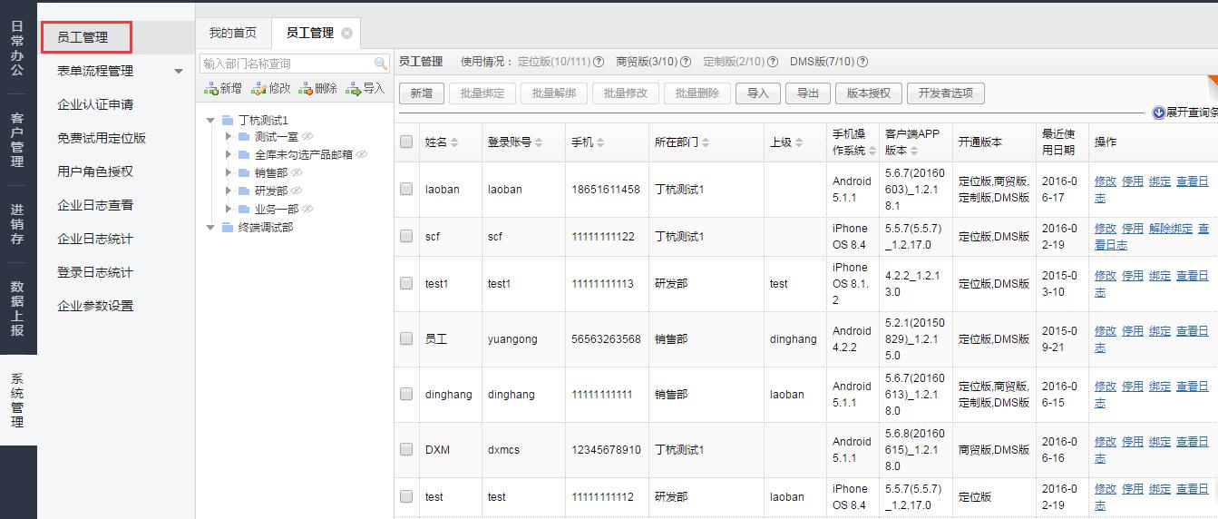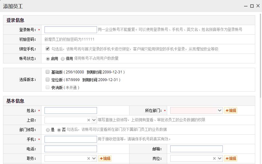 输入登录帐号、姓名、分支机构、手机等信息并分配角色,保存即可创建员工账号;如果勾选了绑定手机,则账号第一次登陆后,就与手机卡自动绑定;也可以为每个员工勾选不同版本使用。