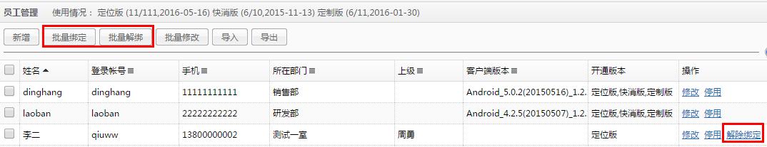 【解除绑定】后,可以更换手机登陆,支持【批量绑定】和【批量解绑】。