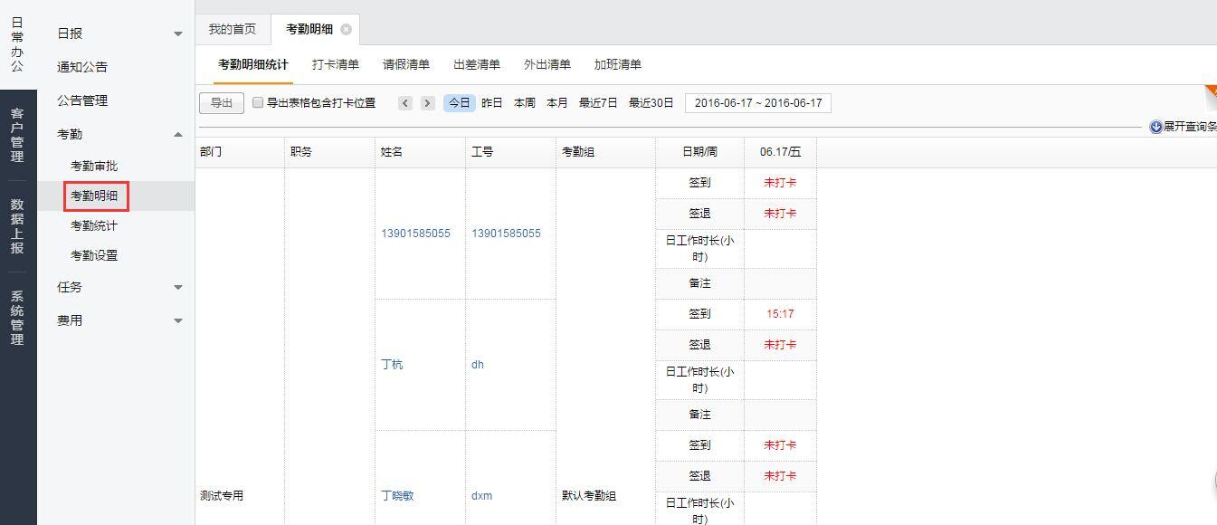 在web端点击【考勤】—【考勤明细】,可以查看自己及下属的考勤明细统计、打卡清单、请假清单、出差清单、外出清单和加班清单。