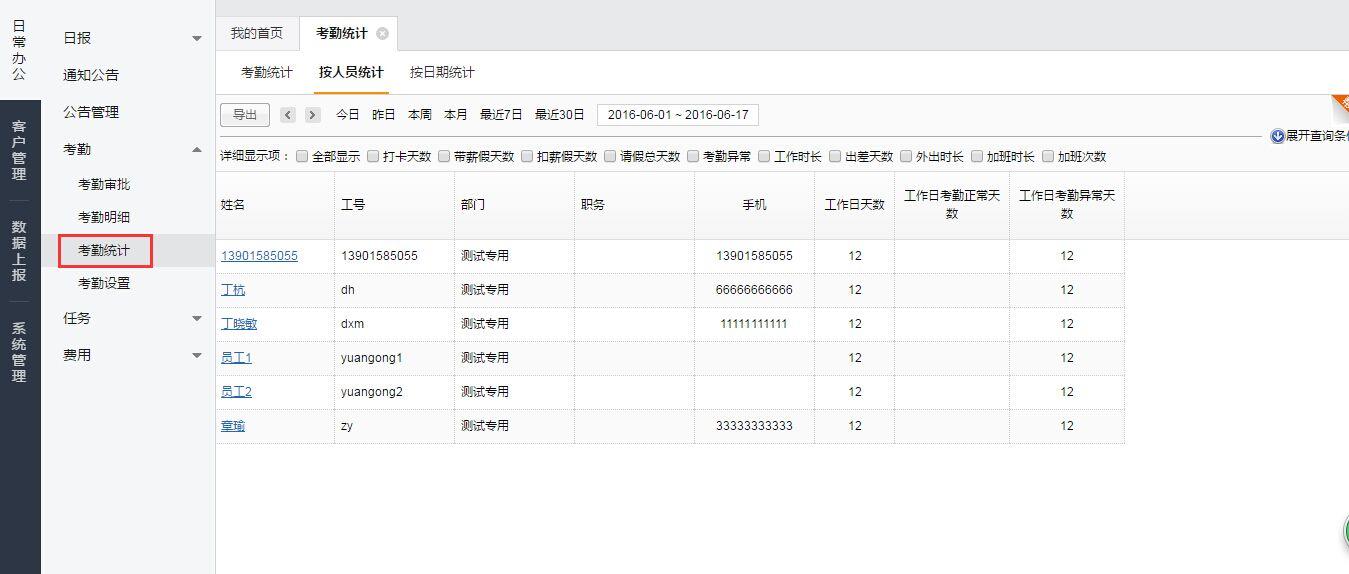 通过【考勤】—【考勤统计】,可以查看到考勤统计数据。