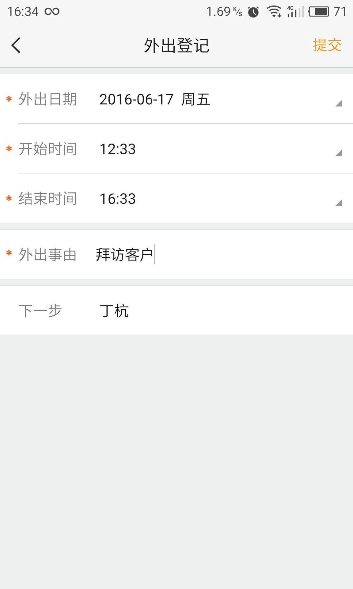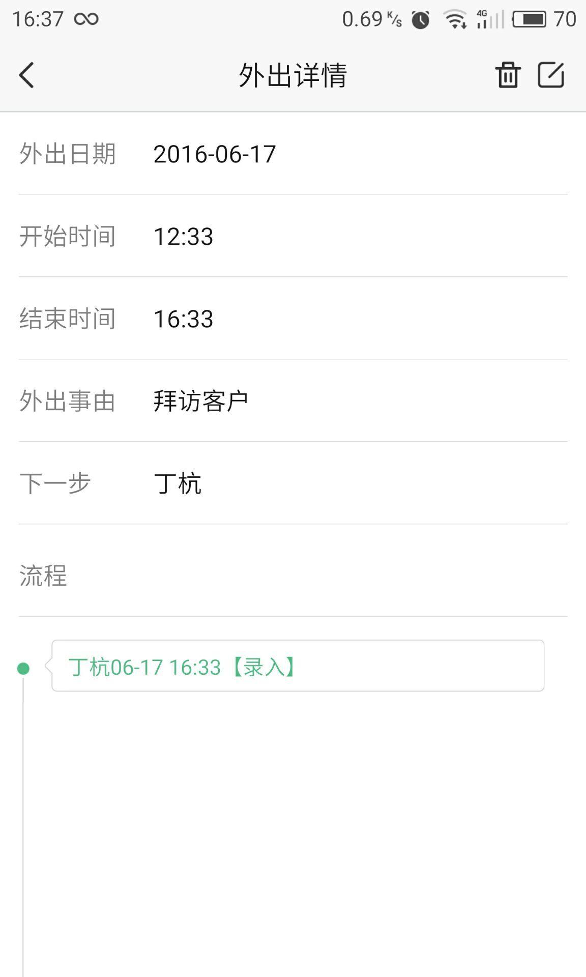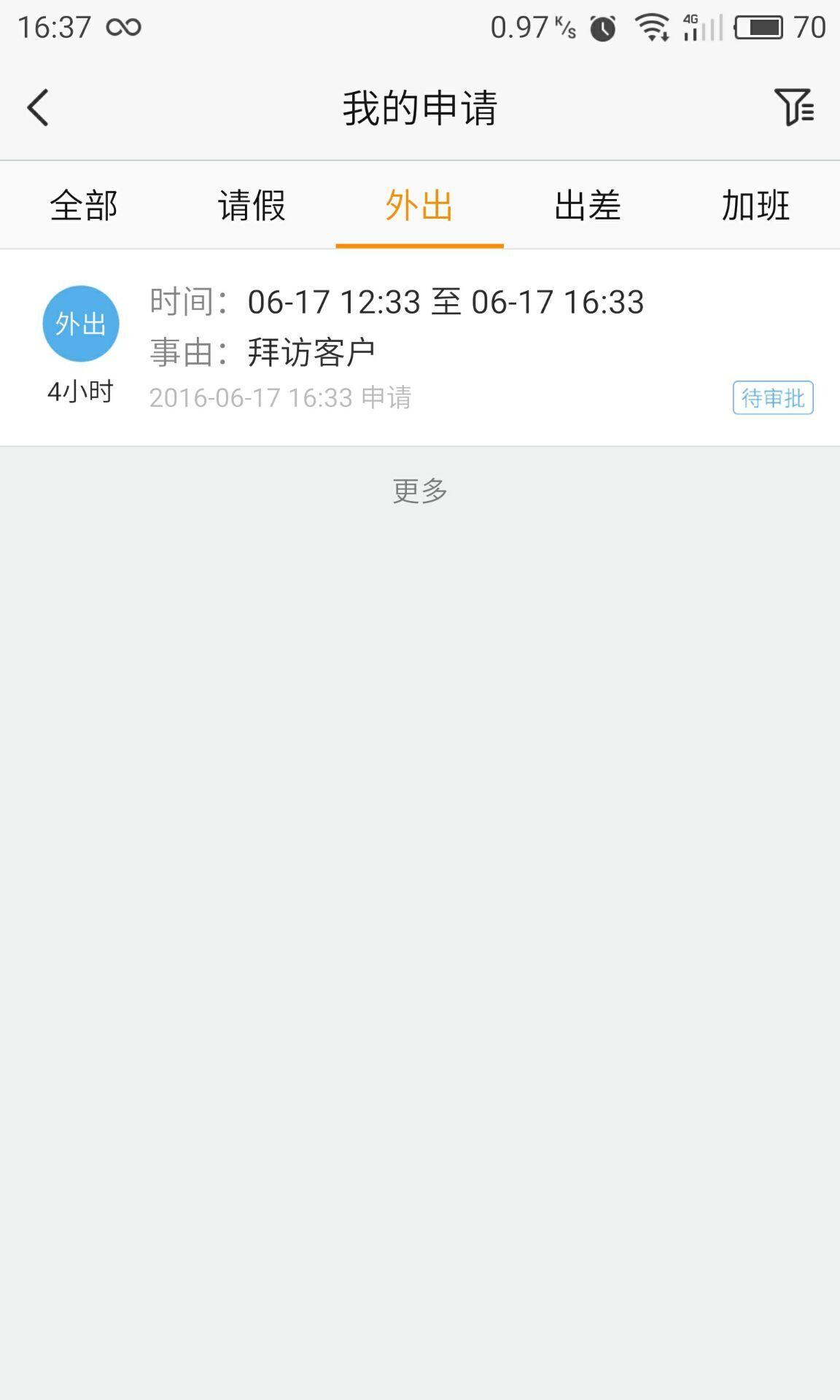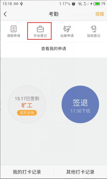 点击我的申请-->外出,查看外出申请记录,审批通过以前可以删除或者修改。