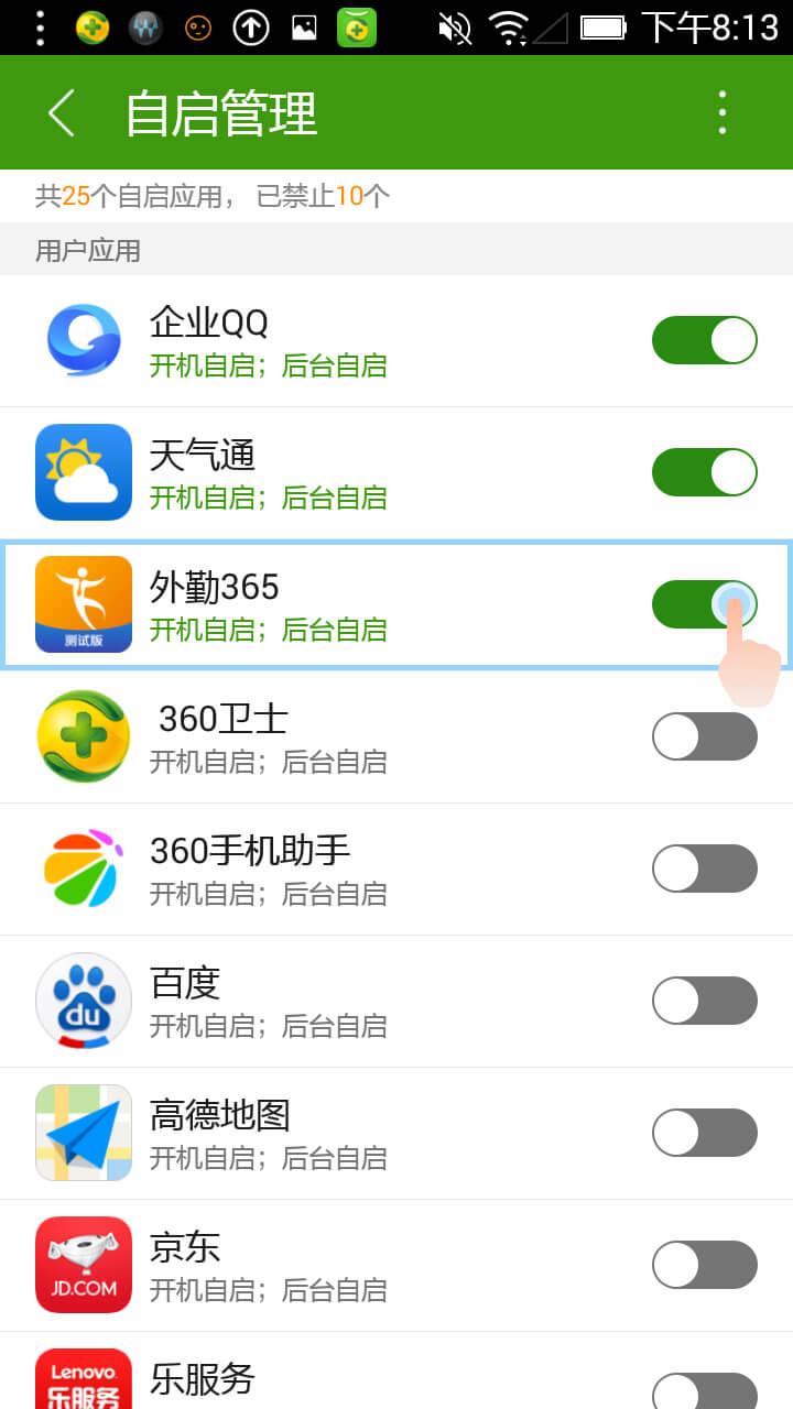 1.打开乐安全,点击清理加速——自启管理——找到外勤365设置成打开