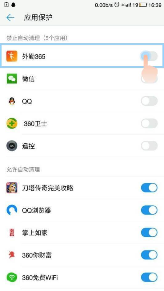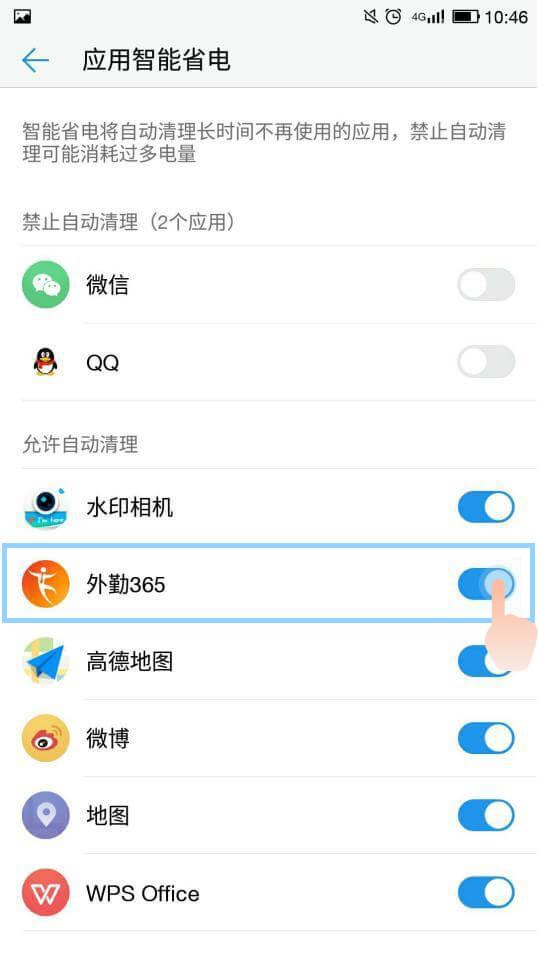 在应用智能省电的允许自动清理找到外勤365并把开关关闭