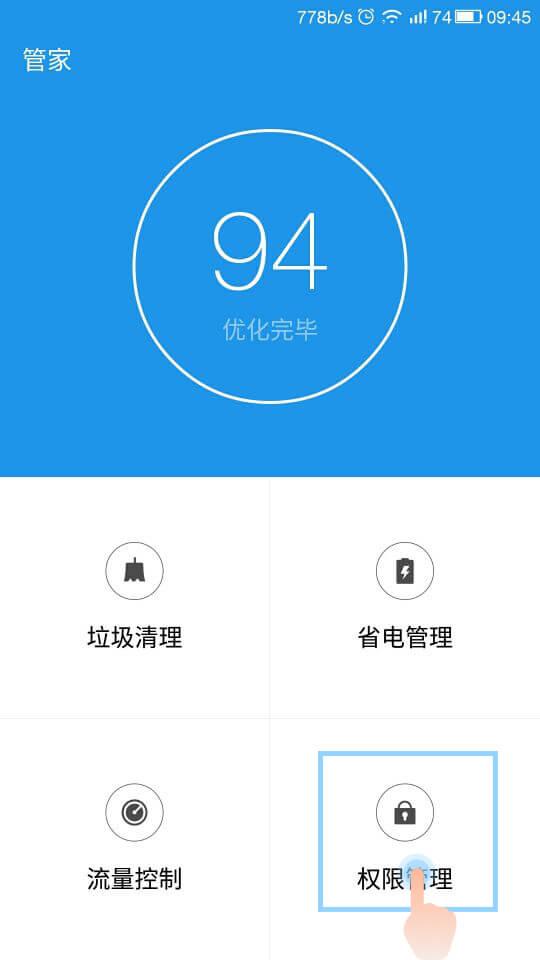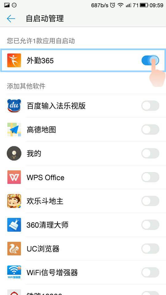 3.返回管家主界面,打开权限管理,选择自启动管理找到外勤365并把开关打开