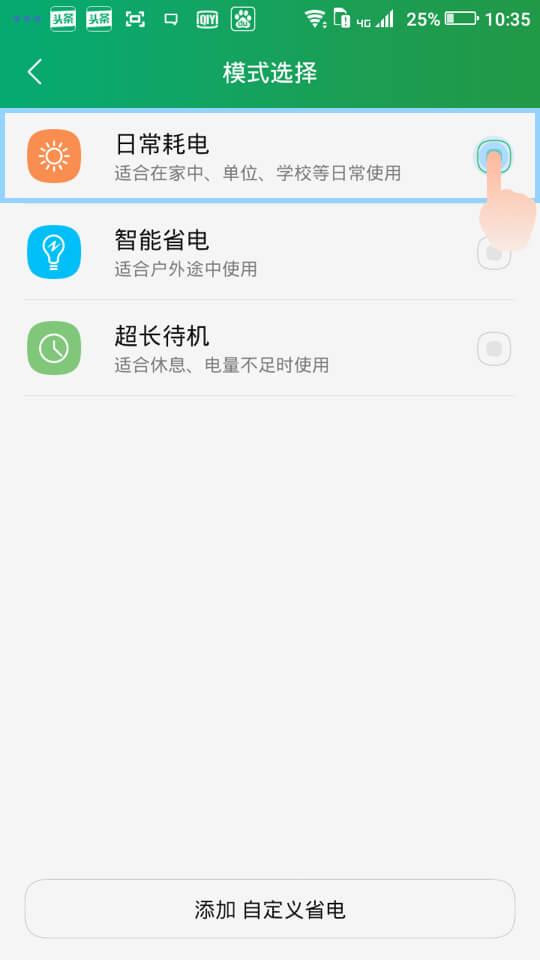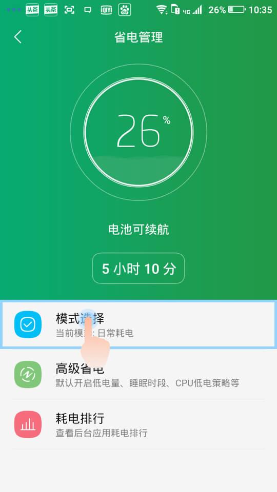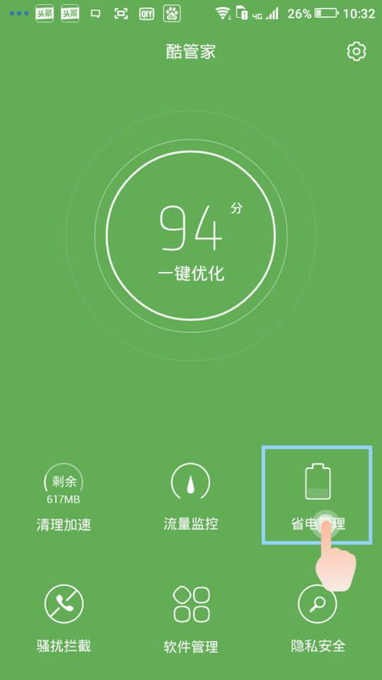 2.回到酷管家页面打开省电管理——模式选择——日常耗电