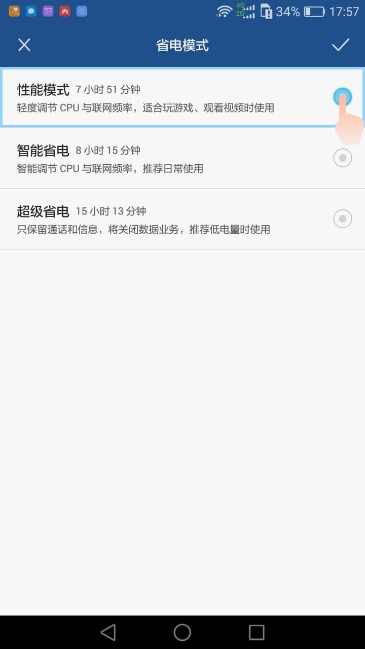 2.手机管家—点击电池管理—省电模式—选择性能模式;