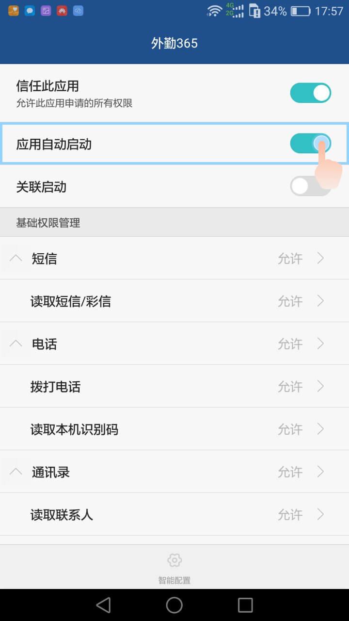 4.手机管家—权限管理—自动启动管理—找到应用—允许应用自启动;