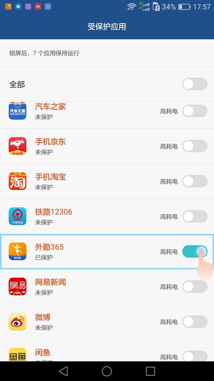 3.点击省电模式下面的受保护应用——允许应用受保护;