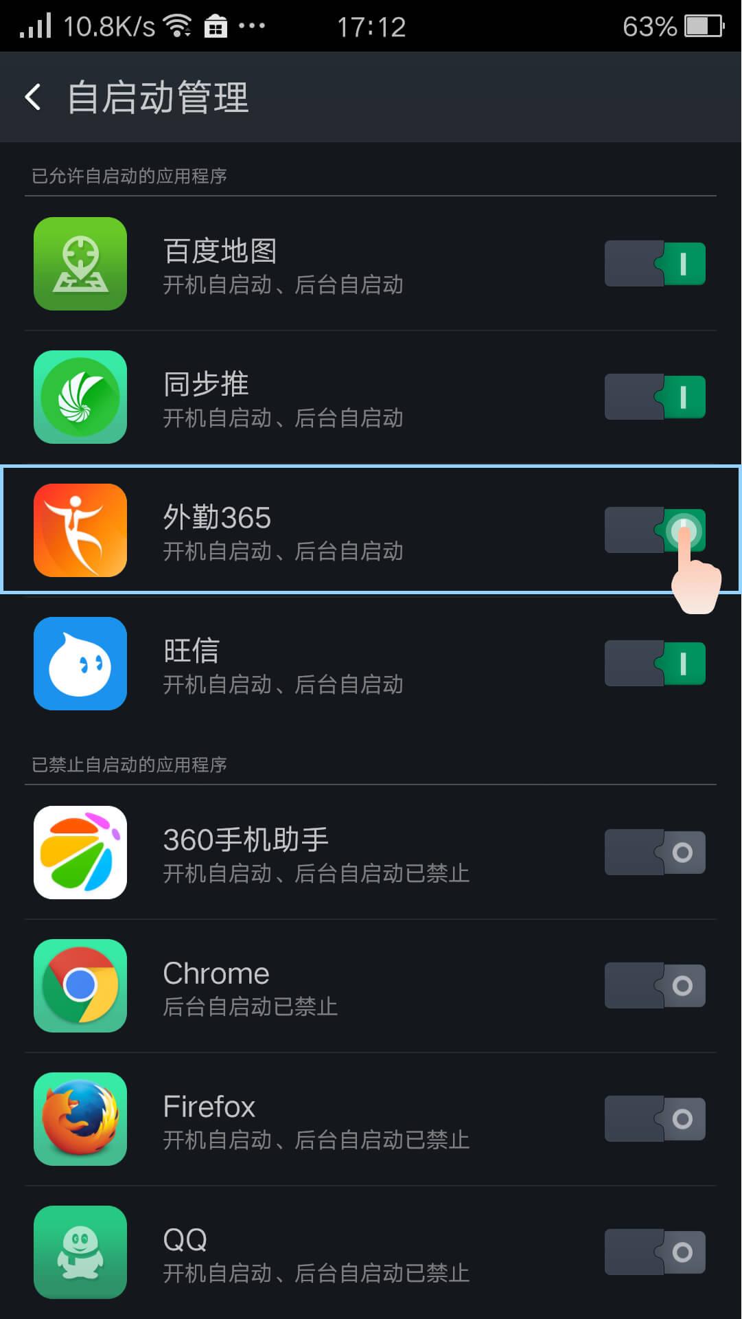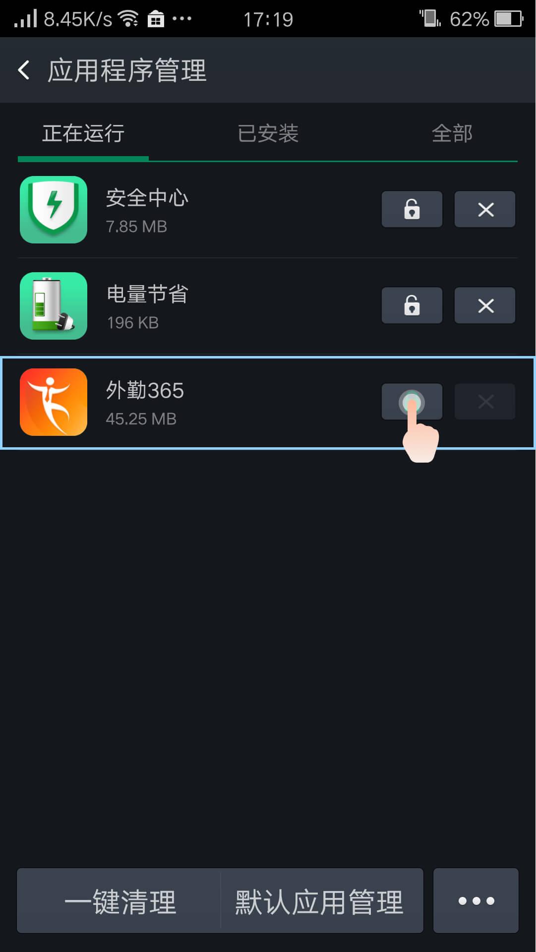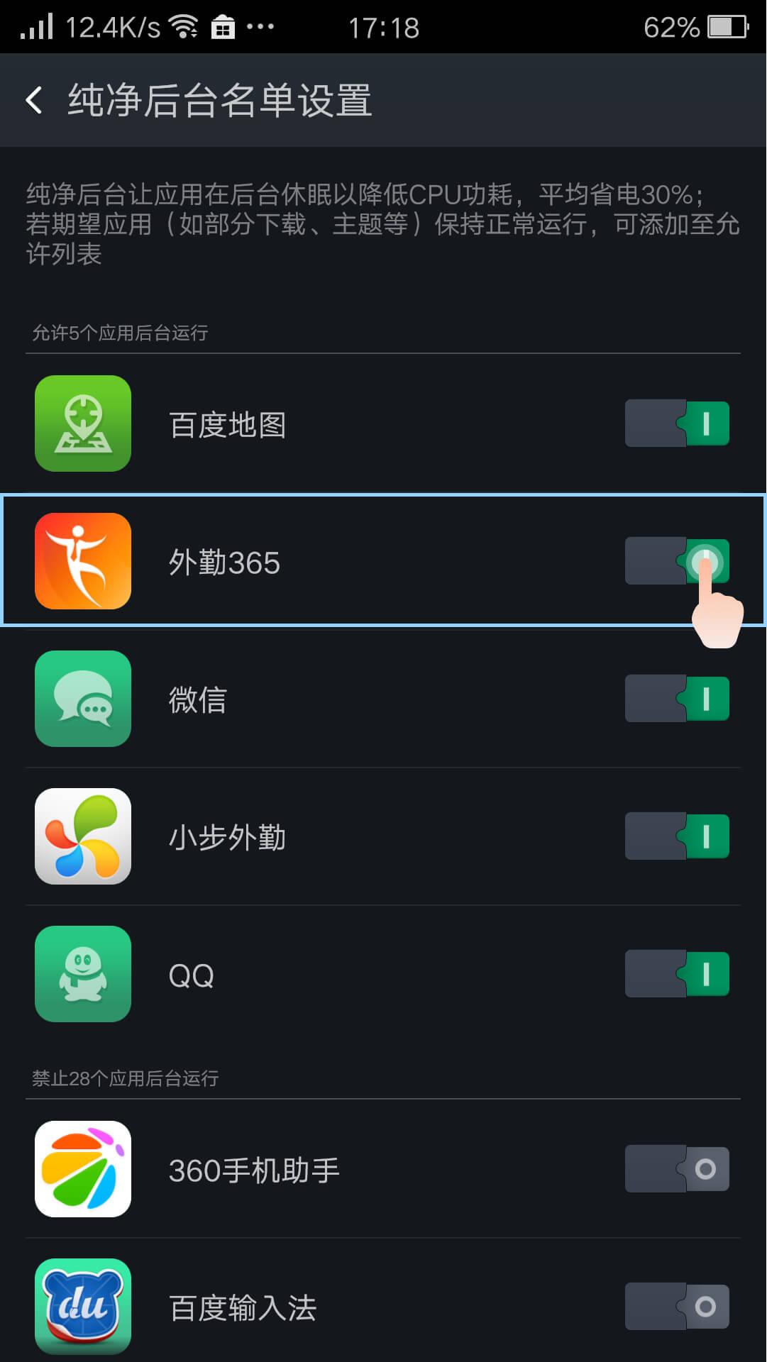4.找到手机设置,在应用程序管理,给外勤365加上锁,如果没有找到,请先运行365并放到后台;把自动清理后台运行的应用关闭;
