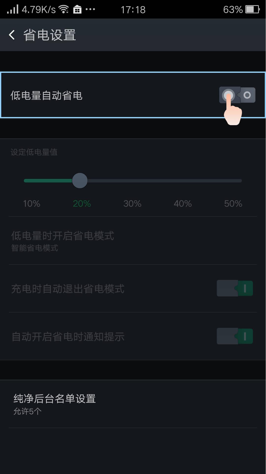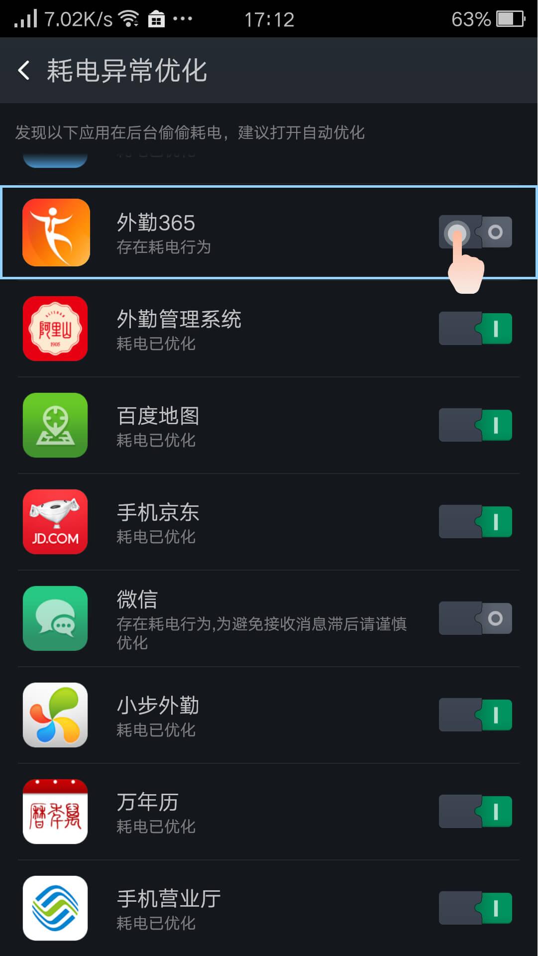 3.点击电量节省,不要选择省电模式,点击上方的耗电详情,点击耗电异常优化进去找到外勤365关掉;关闭低电量自动省电,纯净后台名单设置打开外勤365;