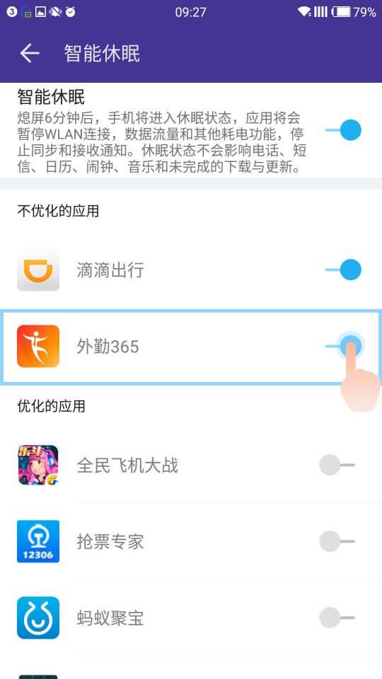 4.点击省电—智能休眠,进去将外勤365设置成不优化应用。