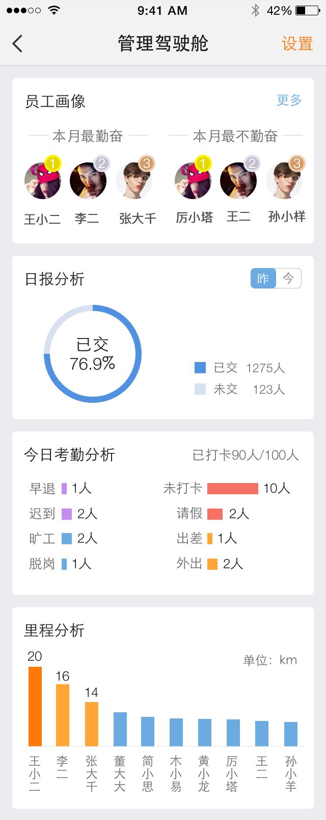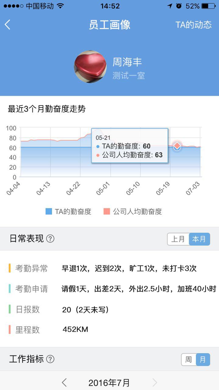 日常表现:从考勤、请假、加班、日报、里程等方面总结员工日常表现。