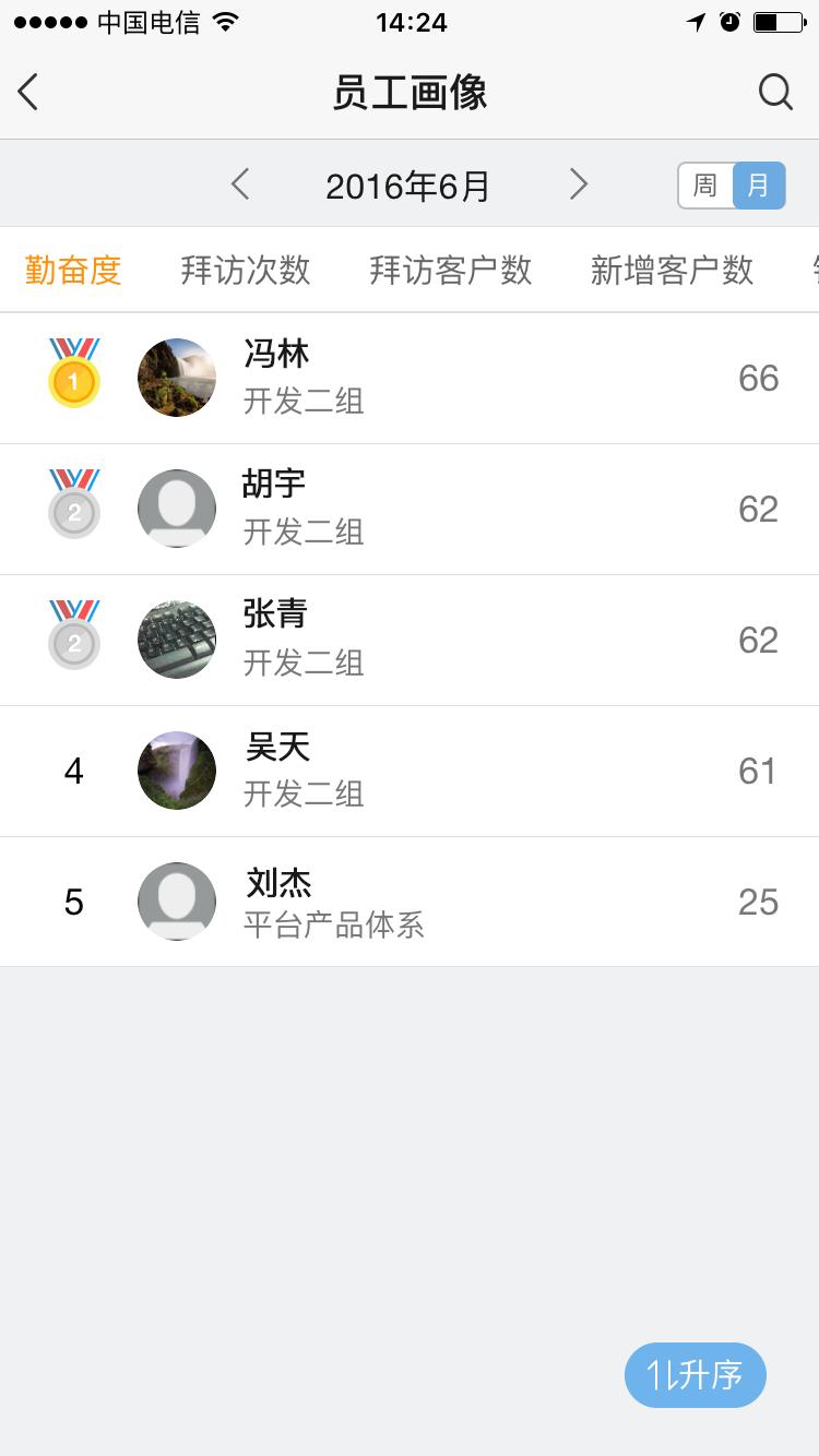 2.按月按周查看全公司员工画像排名,从勤奋度、拜访次数、拜访客户数、新增客户数、销售额等多个维度进行排名。