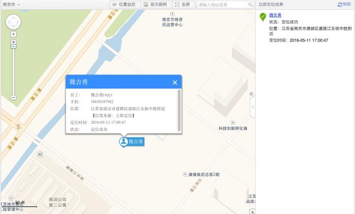 企业管理者通过外勤365电脑端页面实时查看员工位置,点击人员姓名可见具体位置详情,方便就近原则人员调度。
