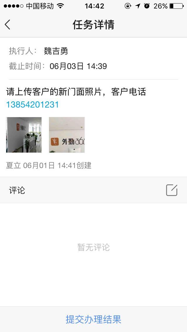 提交后,业务员将在外勤365手机上及时收到上级交办的任务,并可以通过手机查看任务详情,提交现场处理情况汇报给领导。