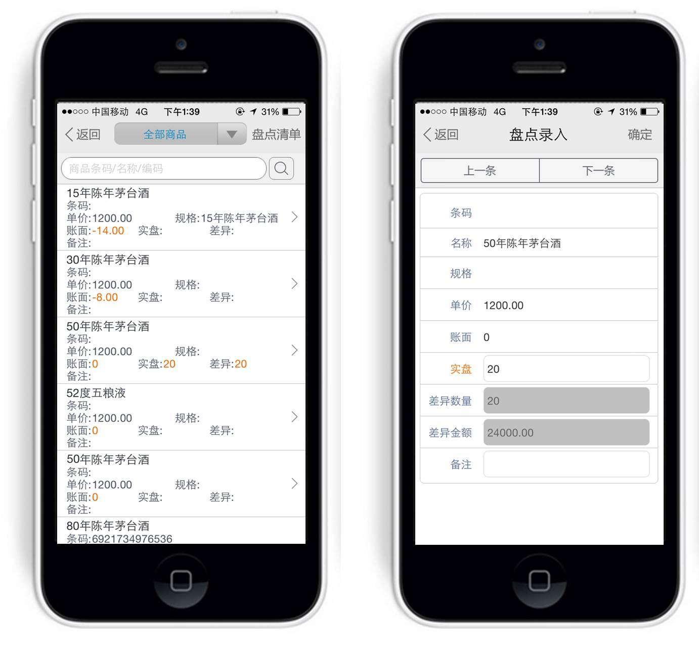 点击“选择商品”或者商品条码扫描,可以逐一对每个商品进行盘点,通过输入“实盘”数量,系统可以立刻与账面数据做比对,实时显示差异数量及金额。