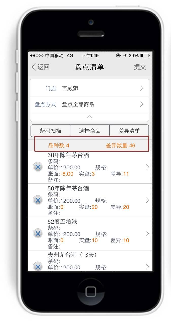 商品盘点完成后,通过点击“盘点清单”,可以查看到盘点的库存品种数和差异数量,以便及时进行库存校正。