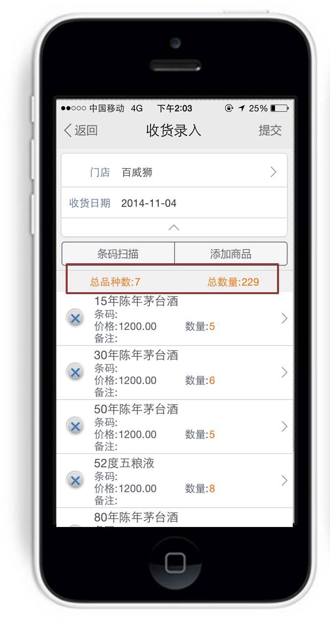 商品录入完成后,点击“确认”按钮,可看到所有收货商品的清单。点击“填报清单”,可查看收货商品的总品种数及总数量,方便商品的清点核对。