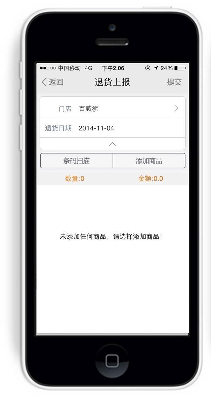 在外勤365手机端选择“退货上报”,可以对门店退货信息进行上报。
