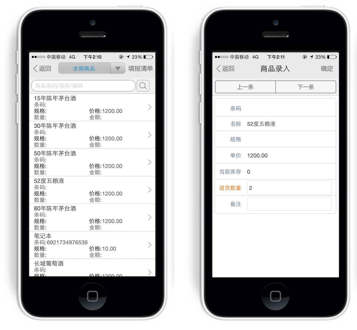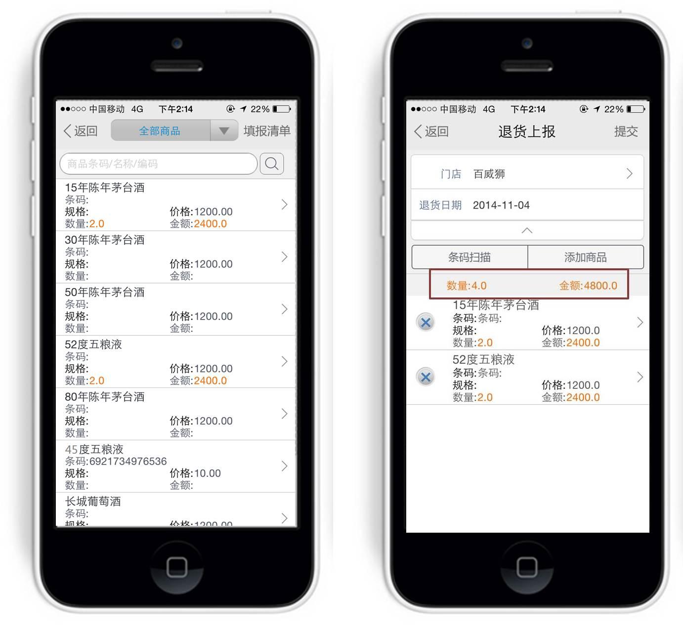 点击“添加商品”或条码扫描,即可进行退货商品的录入,并且可以填写退货原因。
