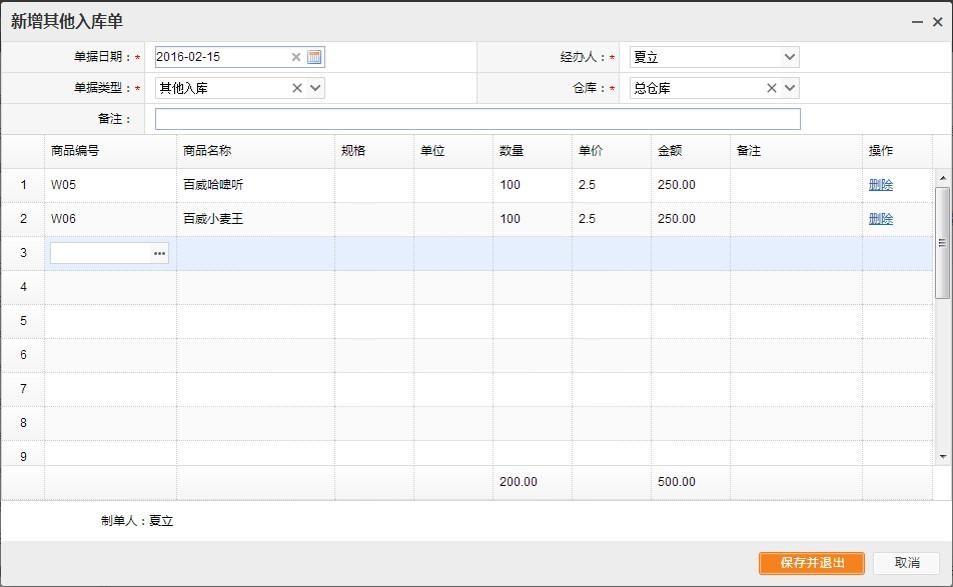 3、新增入库单:支持非采购和销售退货类型的其他入库单据录入。