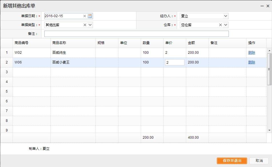 4、新增出库单:支持非采购退货和销售出库类型的出库单据录入。