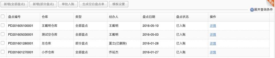 2、库存盘点:仓管员定期对商品库存进行盘点,生成盘点单,比较账存数据与实存数据的差异 。