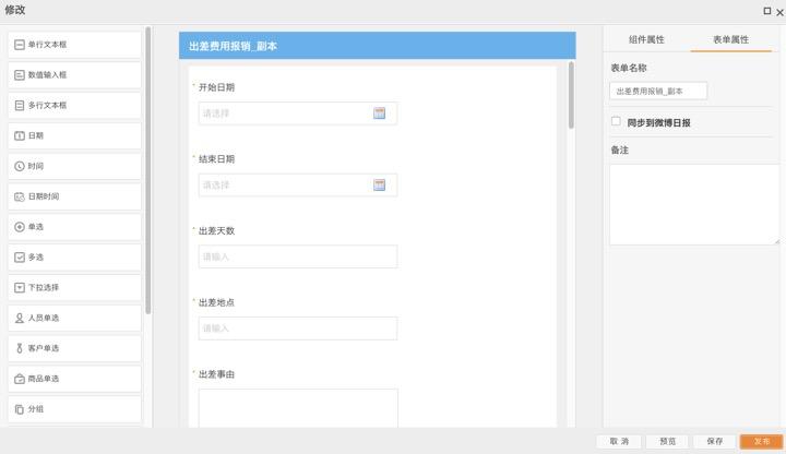 自定义表单,即与流程配合,企业可以自定义所有需要在手机终端录入数据的表单模板,并按权限分给不同的员工,员工在手机上即可按要求上报。通过表单设计工具中文本、选项、日期时间、定位、选人、选客户、选商品、拍照、条码扫描、附件等近20种通用组件的灵活组合,以满足您企业各种手机录入业务场景需求。