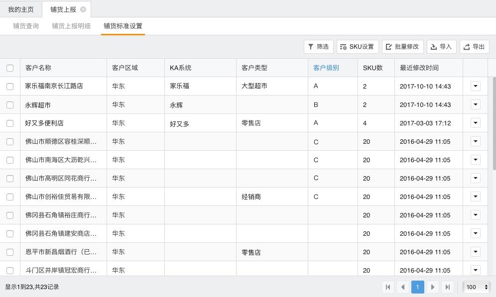 企业管理者除了让业务员上报终端的铺货,还可以设置终端需要铺货的商品SKU(库存进出计量的基本单位)标准,管理者既可以选择某个终端来设置铺货标准,也可以批量操作,一次性导入终端的铺货标准。