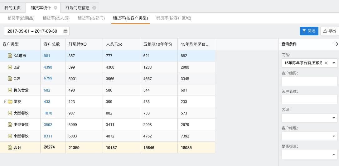 按照客户类型统计铺货率非常有用,但要用这个维度的统计首先要对企业的客户进行分类,这有助于分析不同终端业态下的各种业务数据,也是管理走向更加精细化的表现。在客户类型分类好的情况下,铺货率报表完全可以给企业更好的参考。