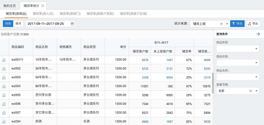 按部门统计铺货率可以看到不同销售区域,不同事业部的铺货情况。企业也可以用按客户区域统计铺货率。