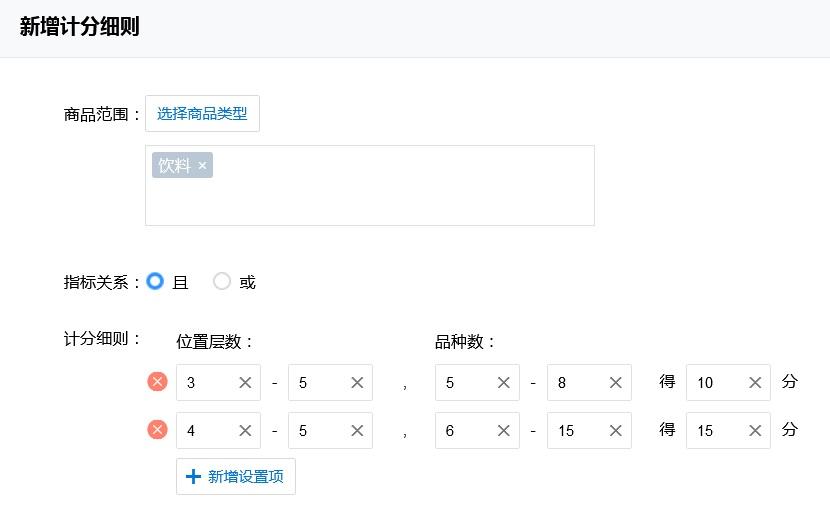 设置场景对应评分的指标:品种数、排面数与占比、位置层数、面积、纯净度等等;