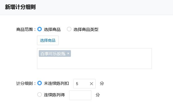 例如:货架场景中,排面数5-8个,且位置在3-5层,则可得10分。