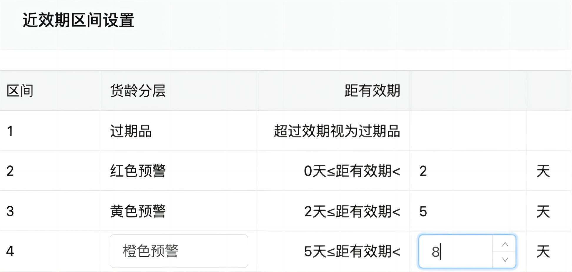 勤策的【效期管理】,帮助张老板实现效期预警,比如还有8天过期的设为绿色预警,还有5天过期的设为橙色预警,还有2天过期的设为红色预警。