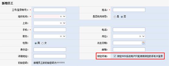 1、对于新增的员工,在“新增员工”界面,系统会默认设置为绑定终端,将企业账号、用户账号、手机卡和密码绑定在一起;