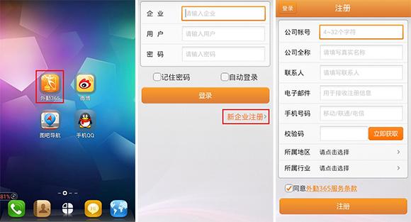 安装完成外勤365客户端之后,在手机软件列表中,找到外勤365客户端程序,登录客户端,在登录页面能看到“新企业注册”按钮,这个是为手机客户端用户提供的快速注册的功能,点击后进入注册页面;