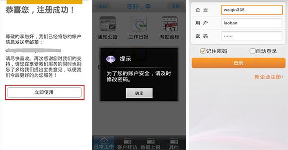 在注册成功页面,点击“立即使用”,可直接登录到外勤365手机客户端中,第一次登录时,系统会提示用户及时修改密码,以保证账户的安全;