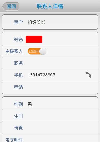 我们点击客户联系人,可以查看联系人详情,里面记录了客户名称、联系人姓名和手机号码等重要信息;