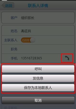 按钮,可呼叫、发送短信或保存为本地联系人。