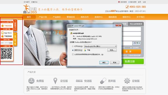 外勤365官网提供了Android客户端的下载链接,我们登陆外勤365的官网(http://www.waiqin365.com),找到左侧的