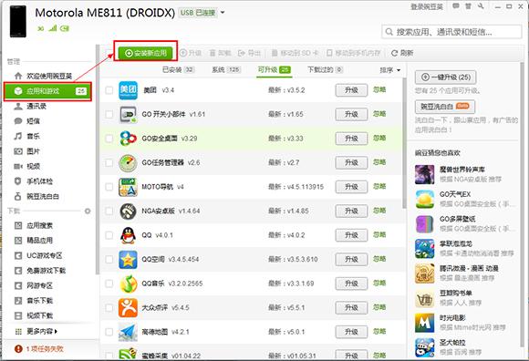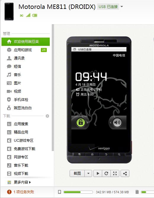 PC上安装豌豆荚软件,将手机通过数据线连接到PC上,如下图: