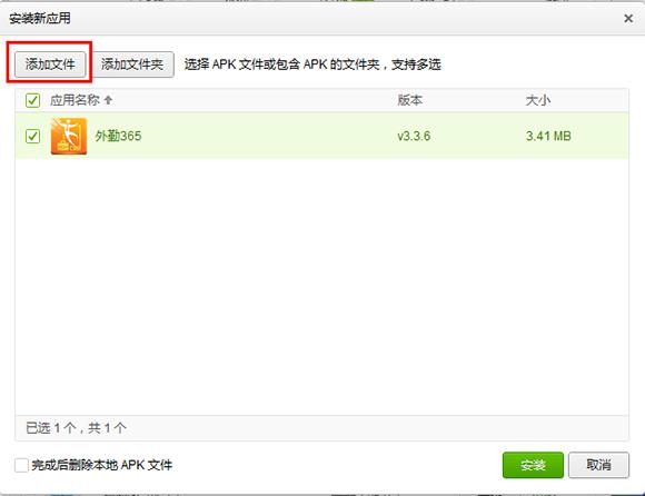 在弹出框中选择“添加文件”,并选中安装包,再选择“安装”,如下图: